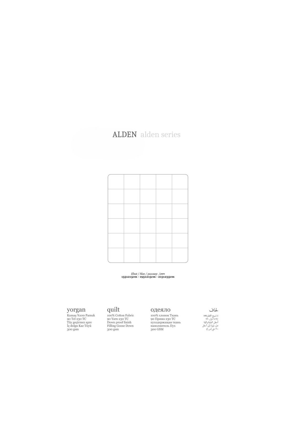 ALDEN %100 Pamuk Tüy Geçirmez Apre İç Dolgu Kaz Tüyü Yorgan, evinizin konforunu artırmak için tasarlanmış lüks bir yatak örtüsüdür. Yüksek kaliteli %100 pamuklu dış yüzeyi sayesinde nefes alabilirlik özelliği sunar ve kullanıcıya son derece hafif bir deneyim sağlar. Bu yorgan, ideal ısı dengesini sağlarken sıcak tutma kapasitesiyle de dikkat çeker.