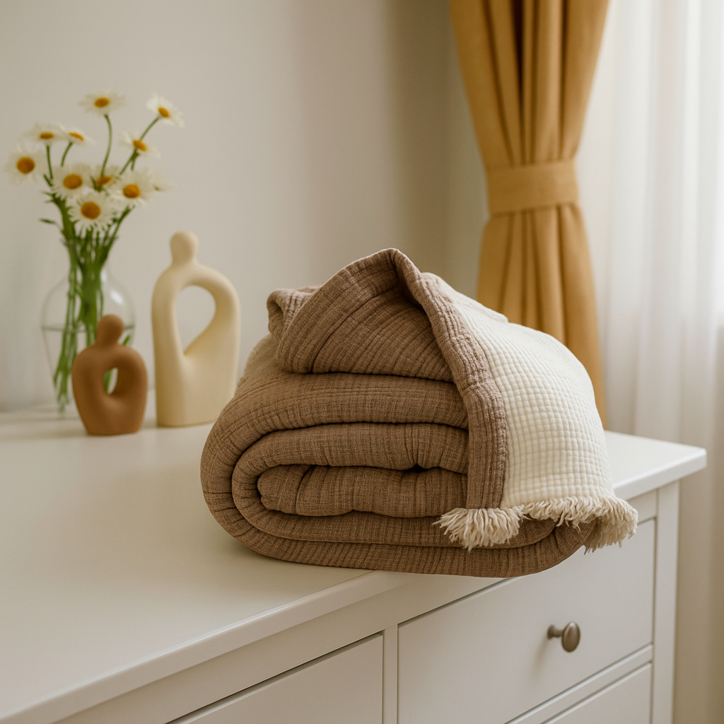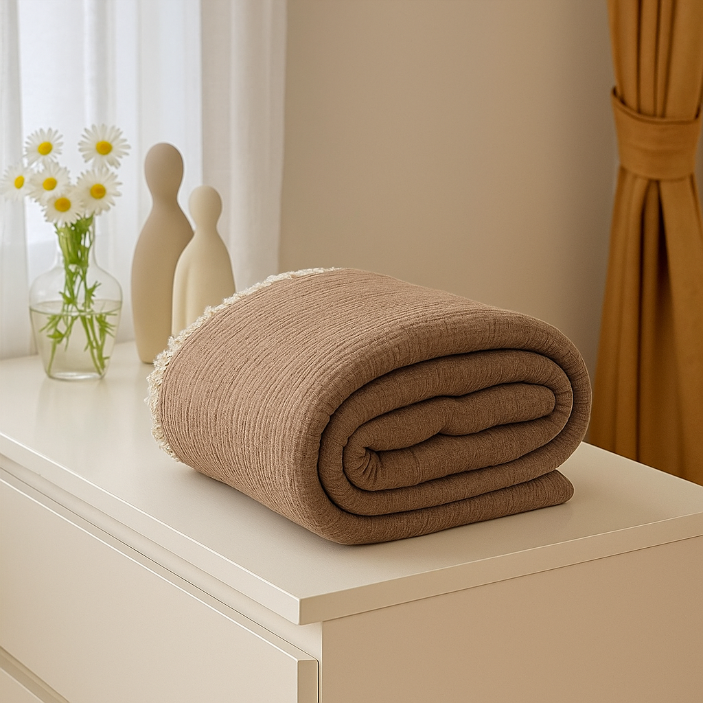 Müslin 6 Katlı Çift Kişilik Kahve Renk Yorgan 240x230 cm, yüksek kalite ve uzun ömürlü kullanım sağlayan bir üründür. Yumuşacık dokusu ve benzersiz tasarımıyla evinizin en sevilen parçalarından biri olacak. Üstelik çift kişilik ölçüsü sayesinde sevdiklerinizle birlikte sıcacık bir uyku deneyimi yaşayabilirsiniz.