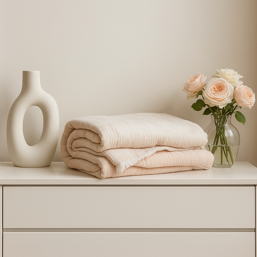 Doğallığın huzurunu ve zarafetin yumuşak tonlarını bir araya getiren toz pembe müslin yorgan, yatak odalarına sade bir şıklık kazandırır.