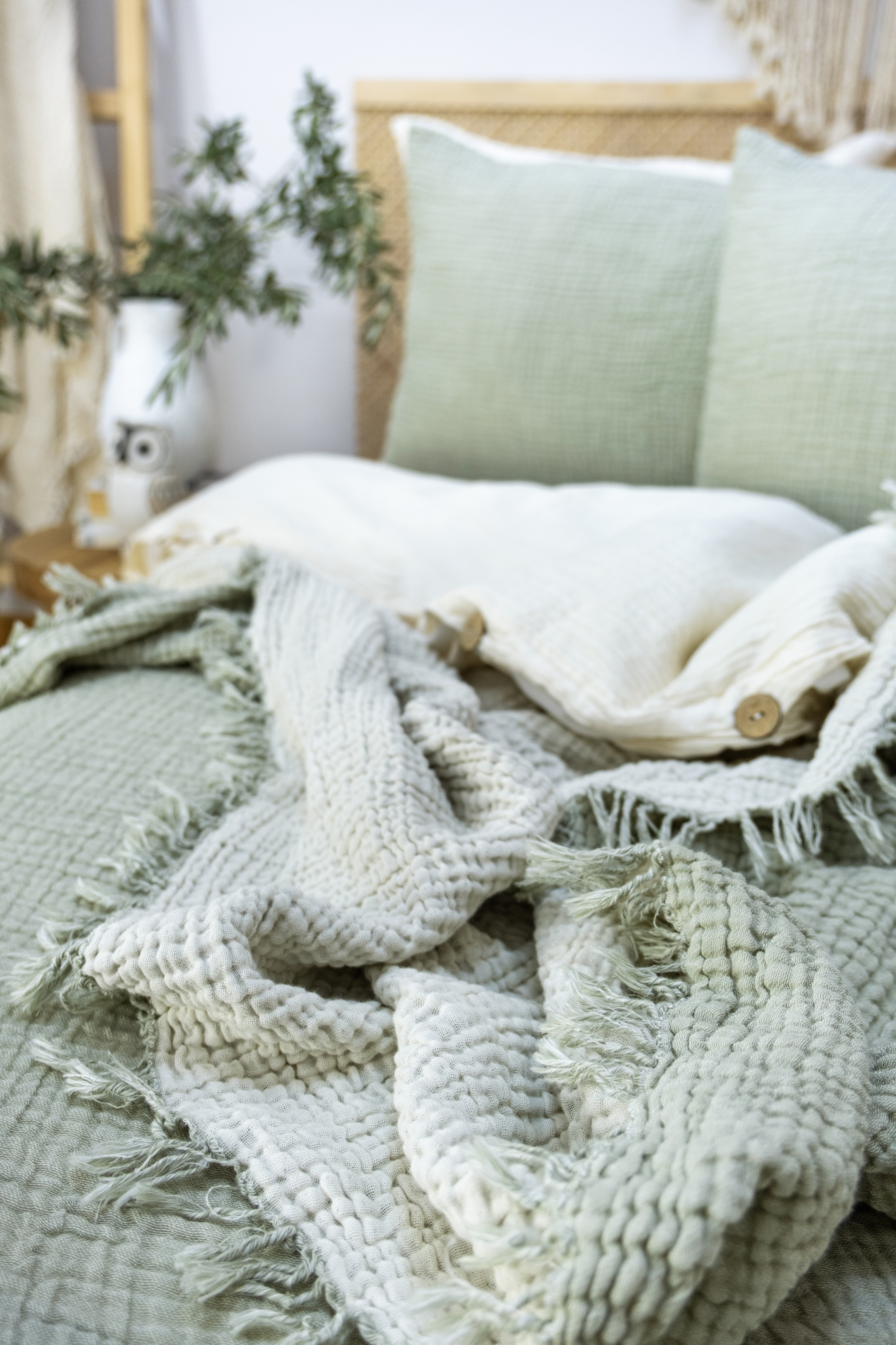 Çağla yeşili renge sahip olan bu yatak örtüsü, doğanın canlı ve ferah enerjisini yatak odanıza yansıtacak. Özenle seçilmiş olan müslin kumaş kullanılarak üretilmiştir. Bu sayede, yumuşak ve hafif dokusuyla size rahat bir uyku deneyimi sunar.