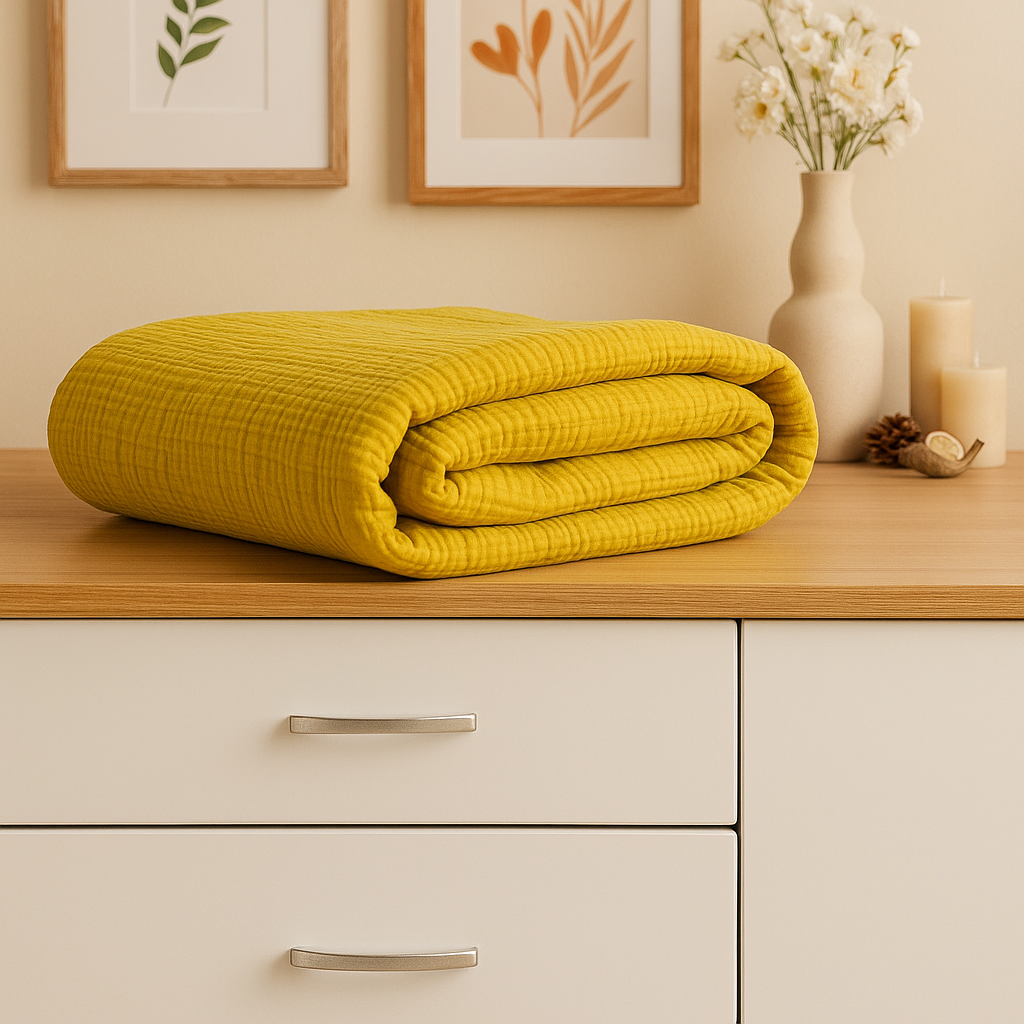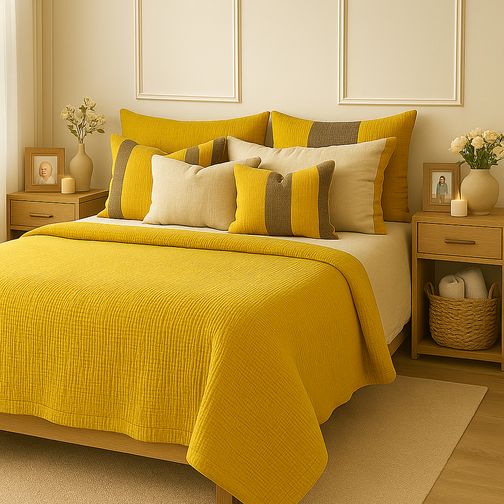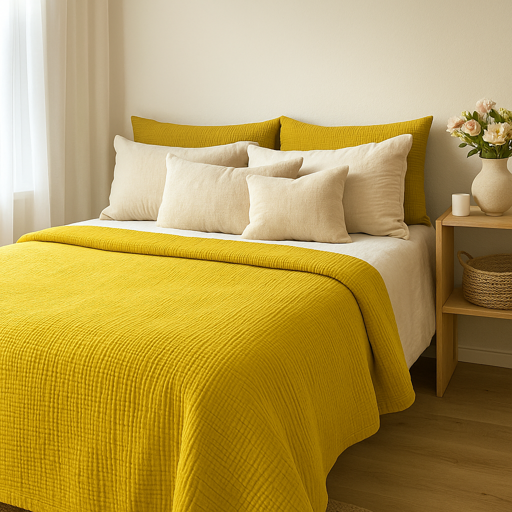 Güneşin enerjisini evinize taşıyan hardal renk müslin yatak örtüsü, doğal dokusu ve yumuşacık hissiyle konforu yeniden tanımlıyor.