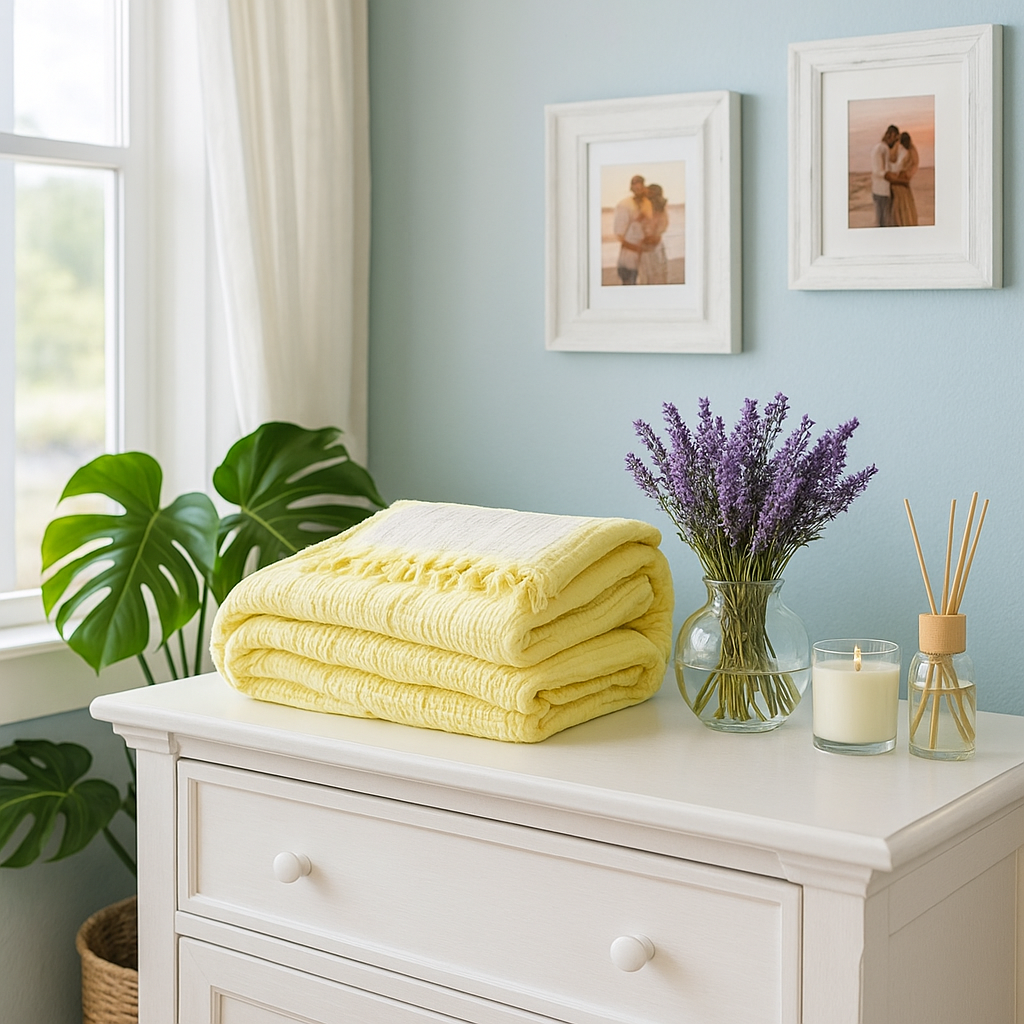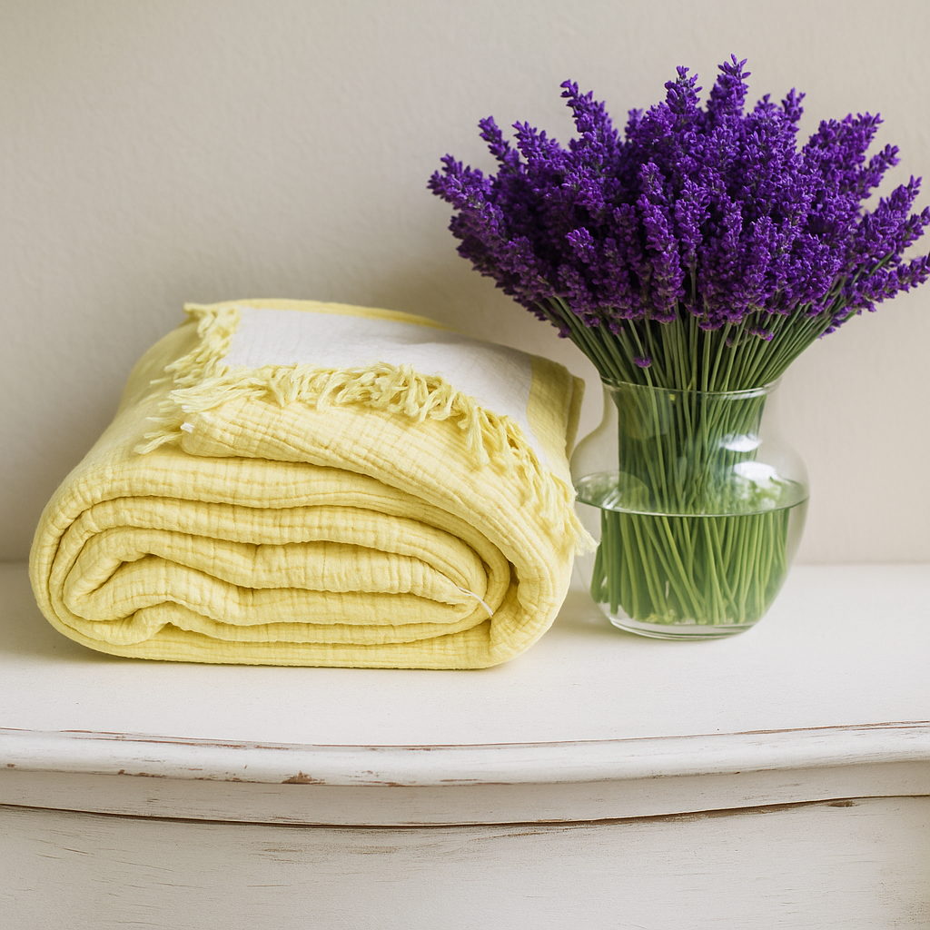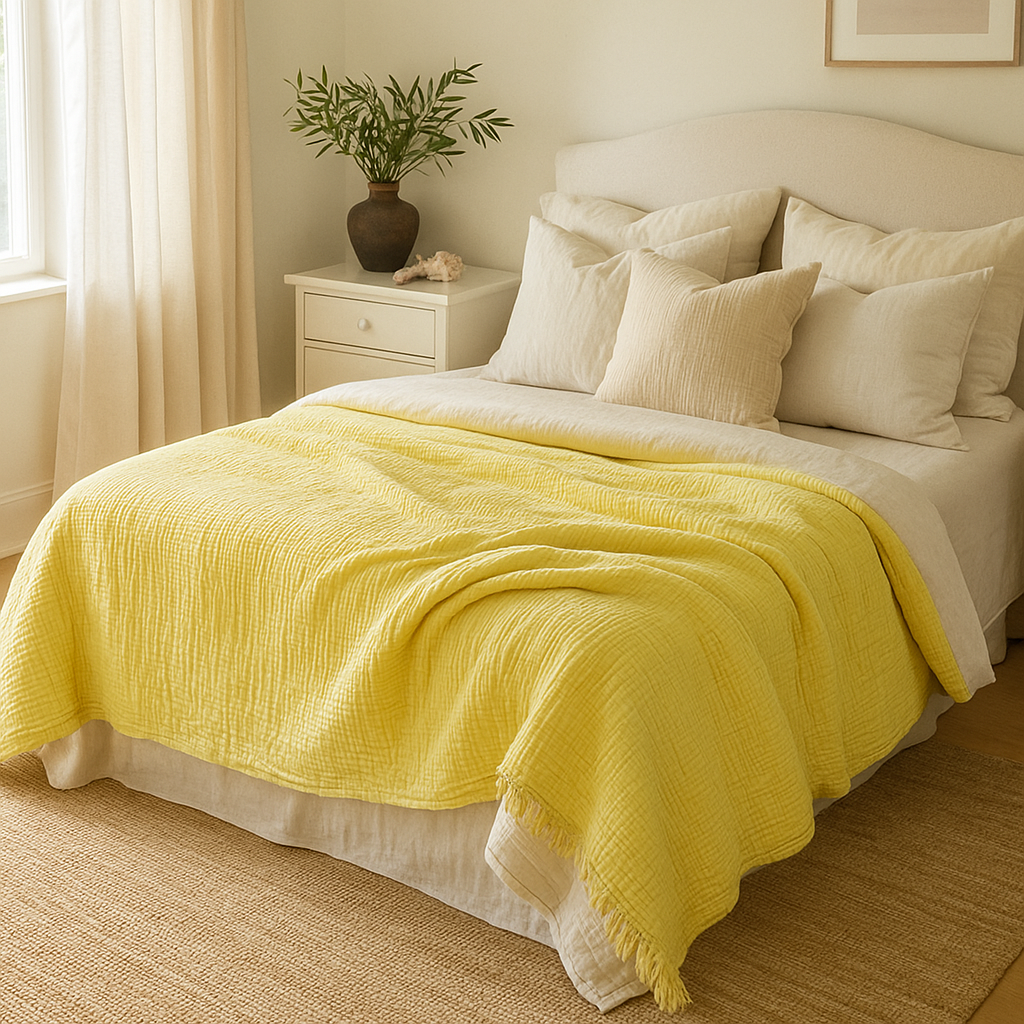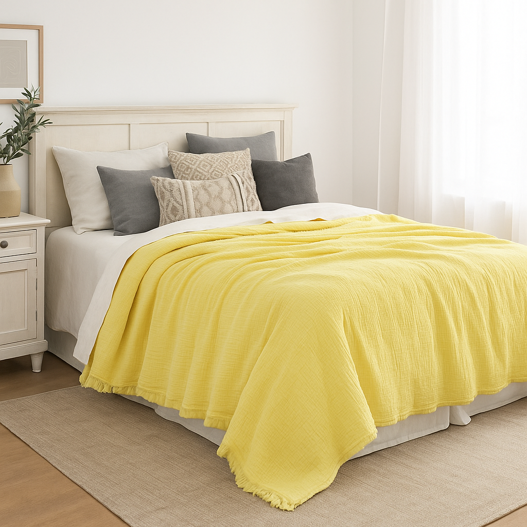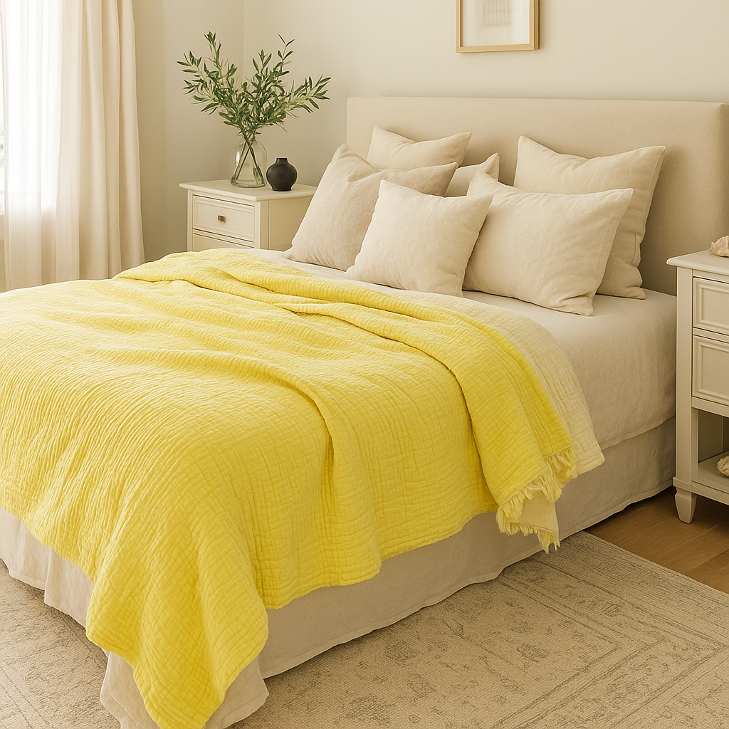 Evinize güneşin enerjisini taşıyan limon sarısı müslin yatak örtüsü, doğallığı ve neşeyi bir araya getiriyor.