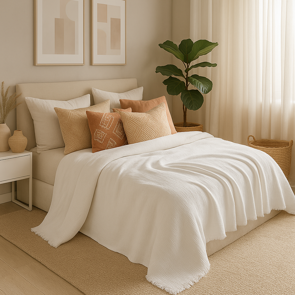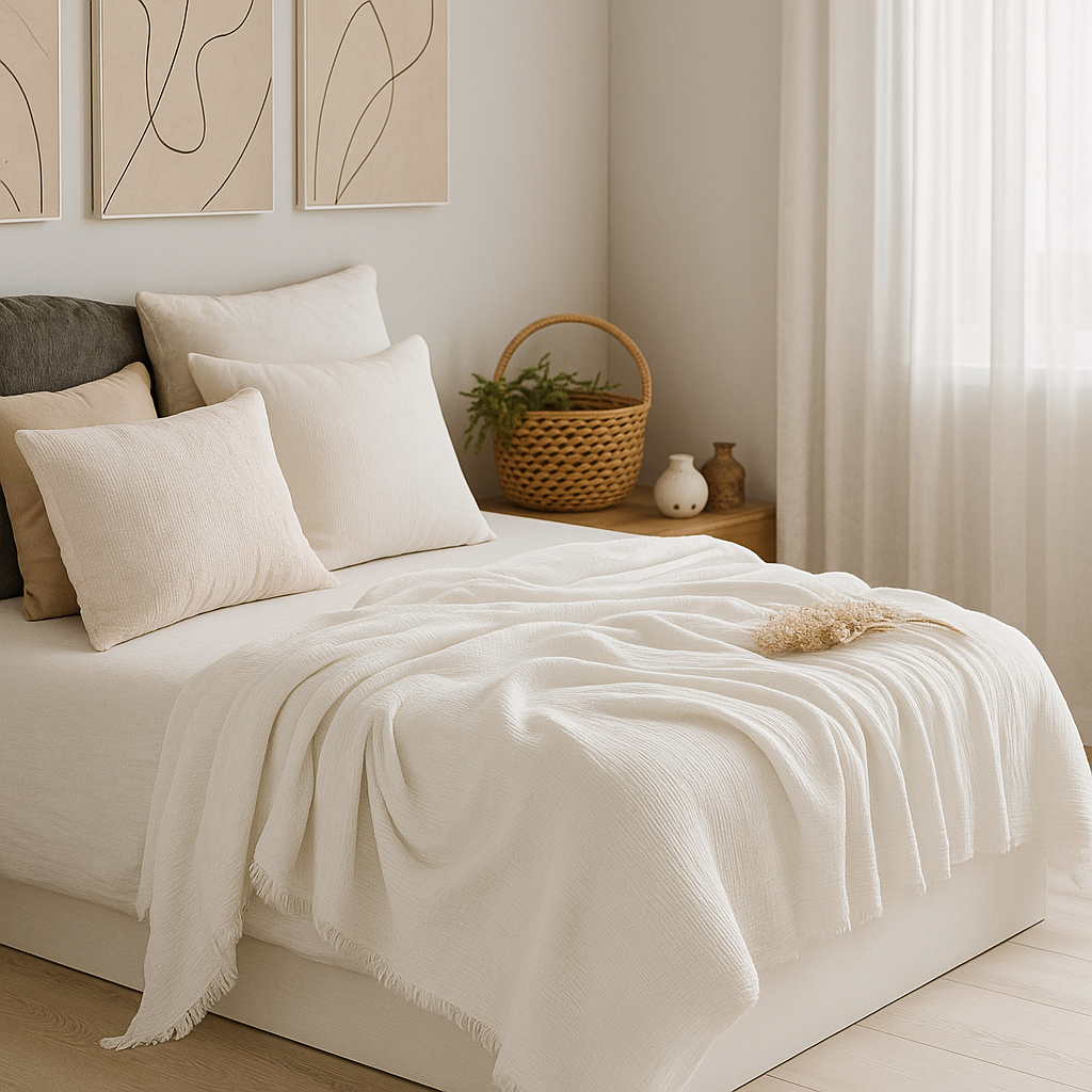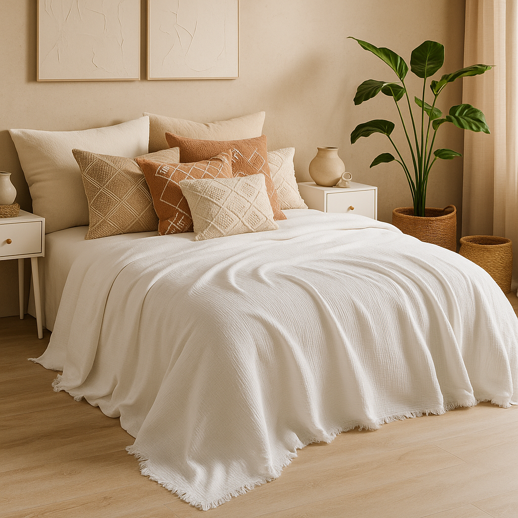 Beyaz müslin örtü, doğadan ilham alan sade ev stillerinin tamamlayıcısıdır. Boho, minimalist veya country tarzı fark etmeksizin, bulunduğu her ortama ferahlık ve zarafet katar.