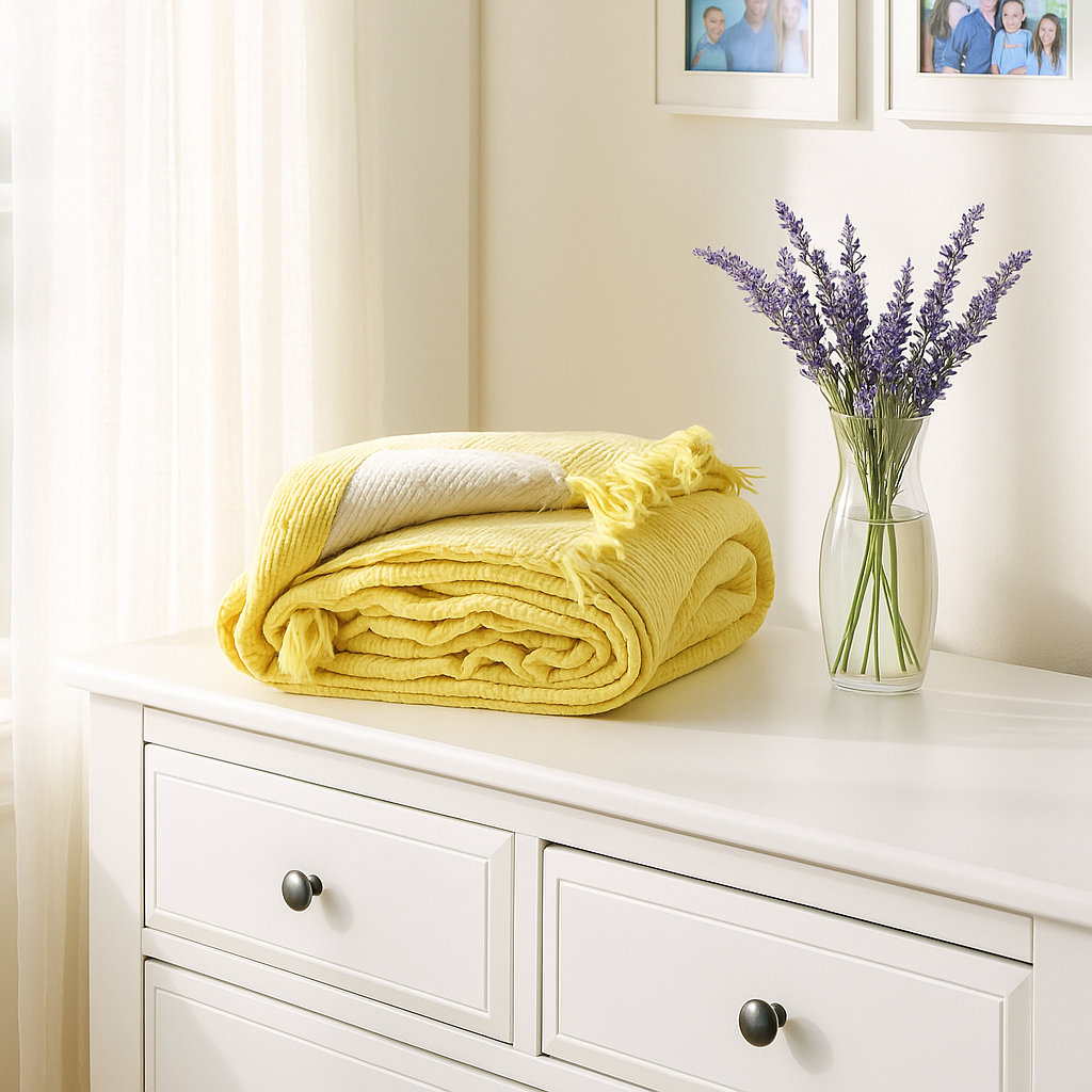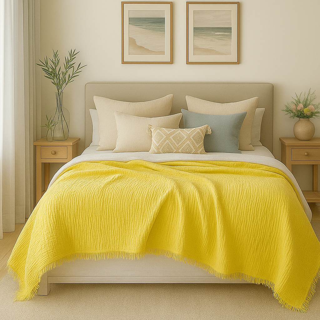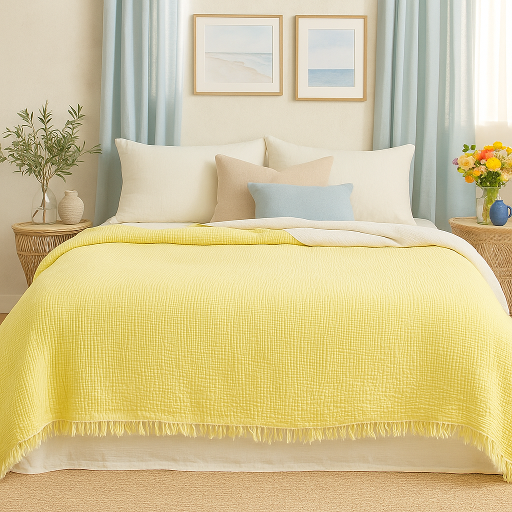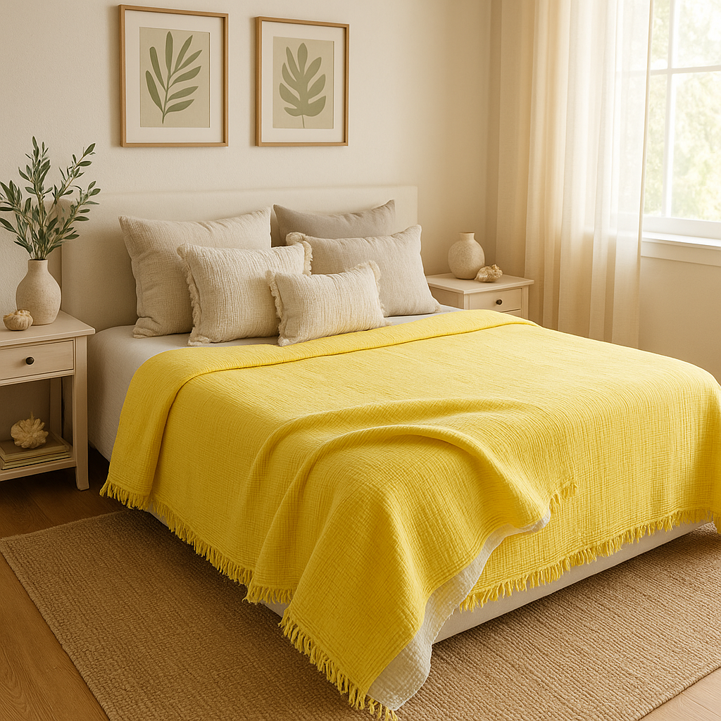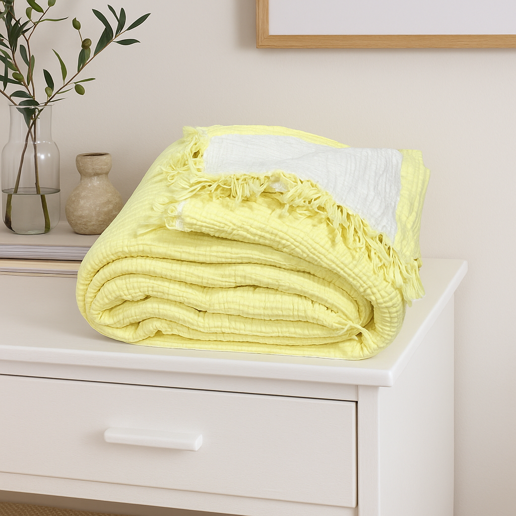 Bu zarif limon sarısı müslin yatak örtüsü, %100 doğal pamuktan üretilmiş 4 katlı özel dokusuyla hem göz alıcı hem de inanılmaz yumuşak bir deneyim sunar. Hafif, nefes alan yapısı sayesinde dört mevsim kullanıma uygundur yazın ferahlık, kışın sıcaklık sağlar.