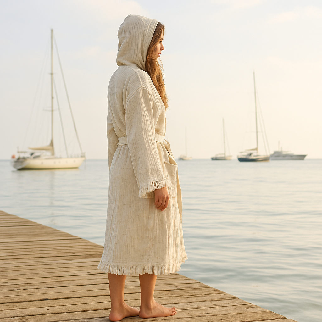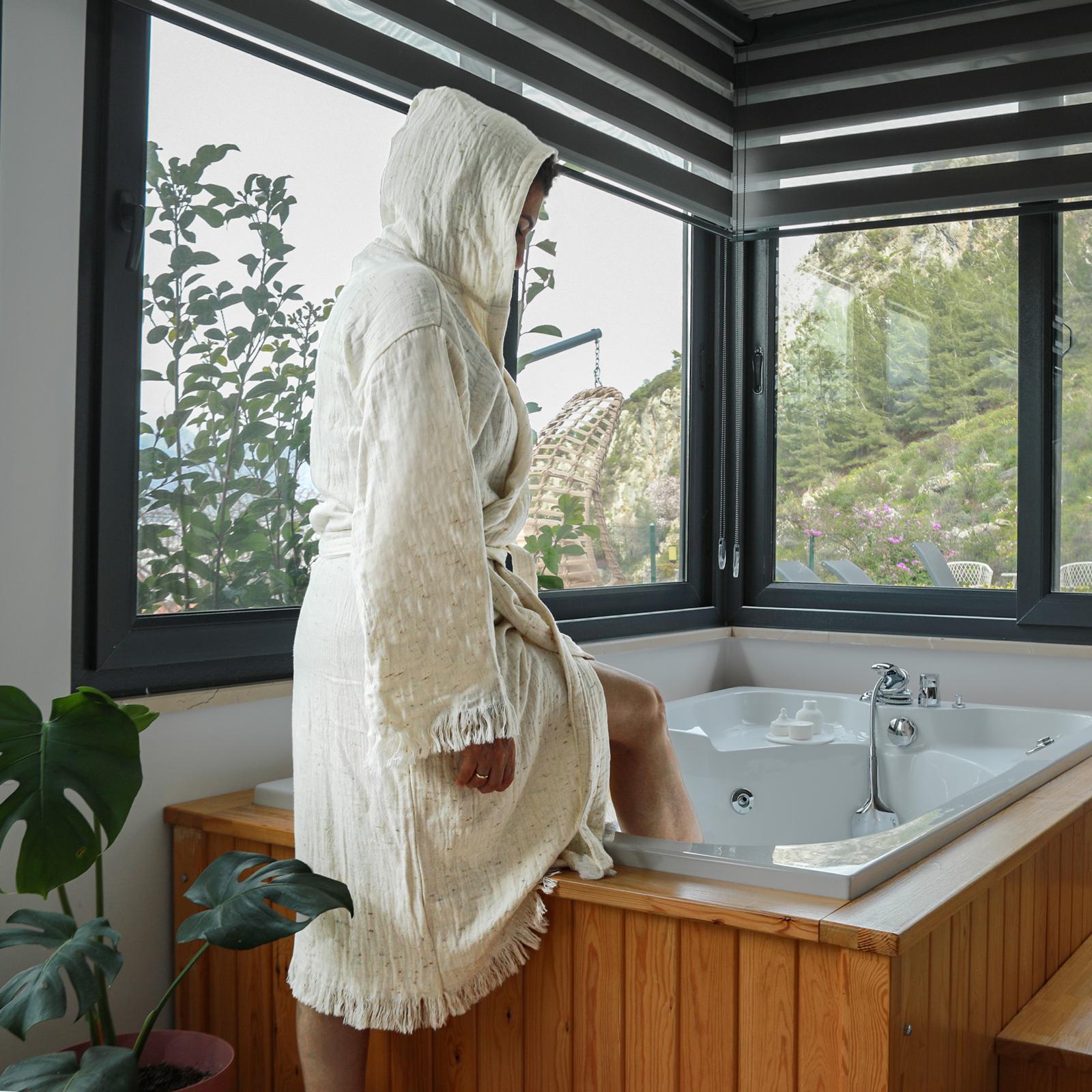 Dahası, doğal renk seçeneği ile her tarzda banyonuza mükemmel uyum sağlar. Minimalist ve şık bir tasarıma sahip olması, bornozu yalnızca bir ihtiyaç olmaktan çıkarıp bir dekoratif unsur haline getirir. Günlük duş sonrası ya da havuzdan sonra rahatlıkla kullanabileceğiniz bu bornoz, kendinizi özel hissetmeniz için tasarlanmıştır.
