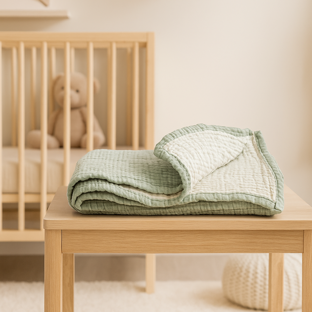 %100 organik pamuk ipliklerle üretilen Çağla yeşili müslin bebek battaniyesi, yumuşacık dokusu ve nefes alan yapısıyla bebeğinizin cildine en nazik dokunuşu sunar. Müslin kumaşın doğal lifleri sayesinde hava dolaşımını destekler, terlemeyi önler ve dört mevsim boyunca ideal bir kullanım sağlar.