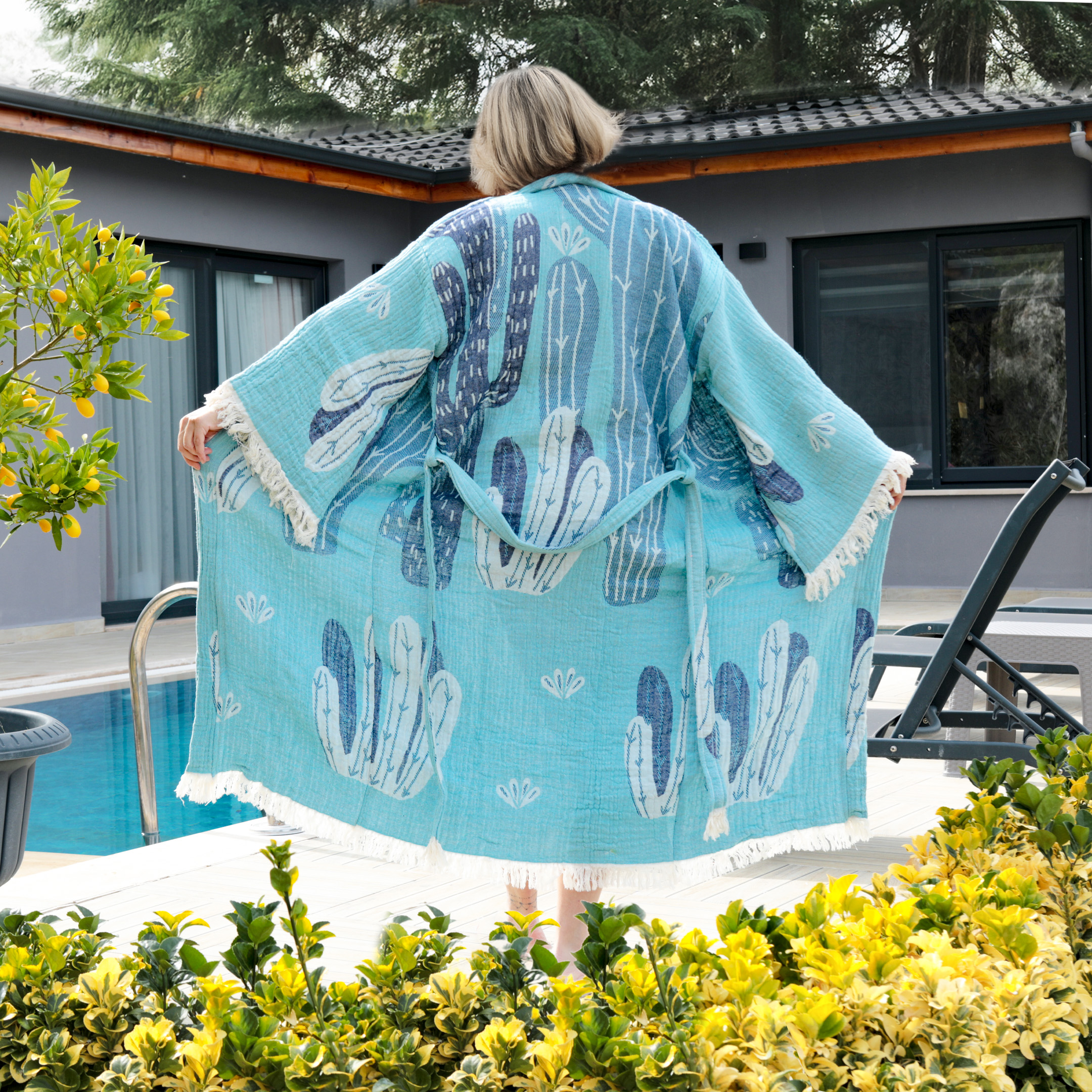 Bu kimono, evde rahatlamak istediğinizde, plajda güneşlenirken veya arkadaşlarınızla keyifli bir gün geçirirken kullanabileceğiniz çok yönlü bir parçadır. Seyahatlerinizde ise hafifliği sayesinde bagajınıza kolaylıkla sığar ve her koşulda yanınızda taşıyabilirsiniz.