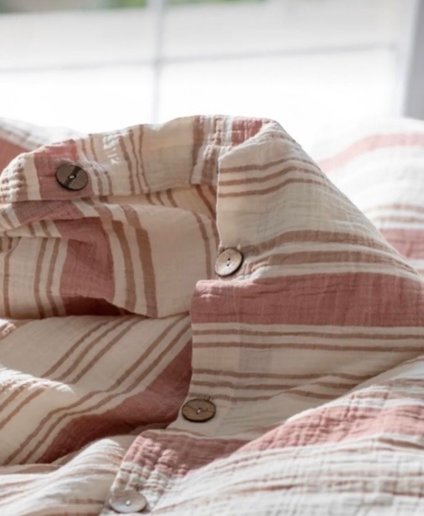 Modern çizgili tasarımı ile yatak odanıza zarif bir hava katan Müslin Nevresim Takımı, her yaştan kullanıcıya hitap eder. Kiremit renk, özellikle sonbahar ve kış aylarında sıcak bir atmosfer yaratır, diğer ev tekstili ürünleri ile kolayca kombinlenebilir. Artık yatak odanız, sadece uyku için değil, aynı zamanda dinlenme ve keyif alma alanı olacak.