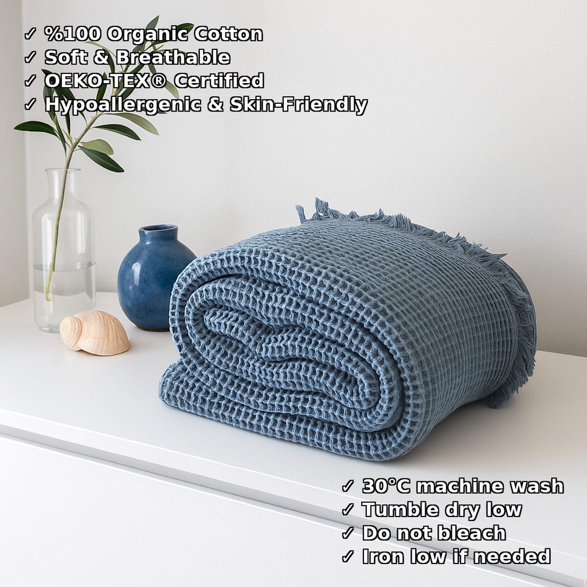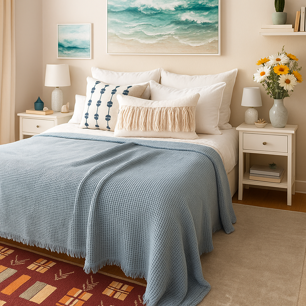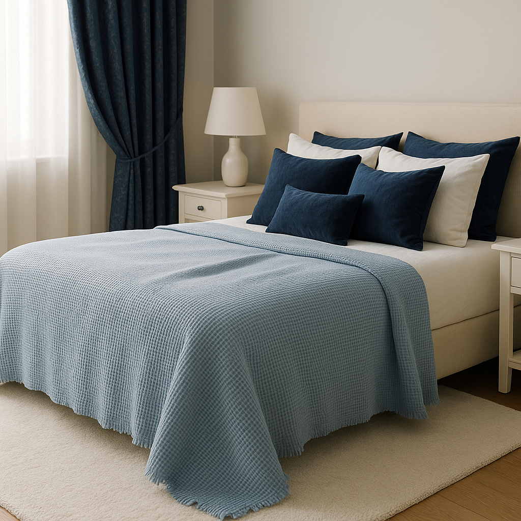 Deniz mavisi tonunun huzur verici etkisi, waffle dokusunun modern dokunuşuyla birleşir. Bu yatak örtüsü, yatak odana taze bir enerji, dinginlik ve doğadan gelen zarif bir ferahlık kazandırır. 🌤️