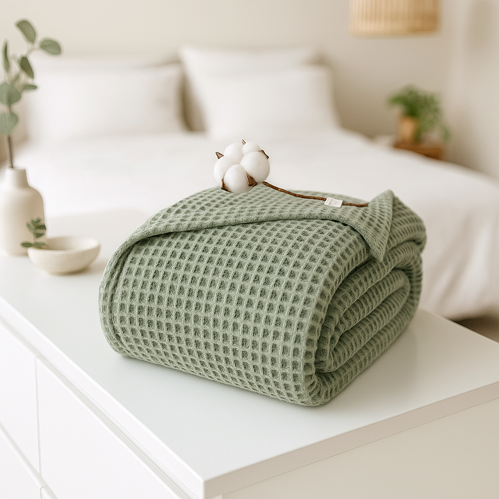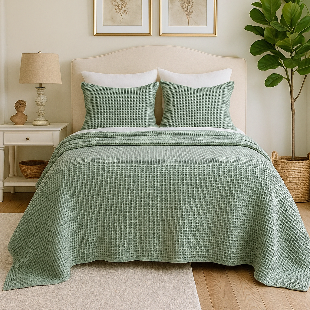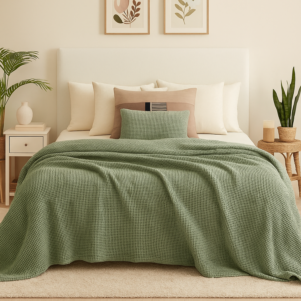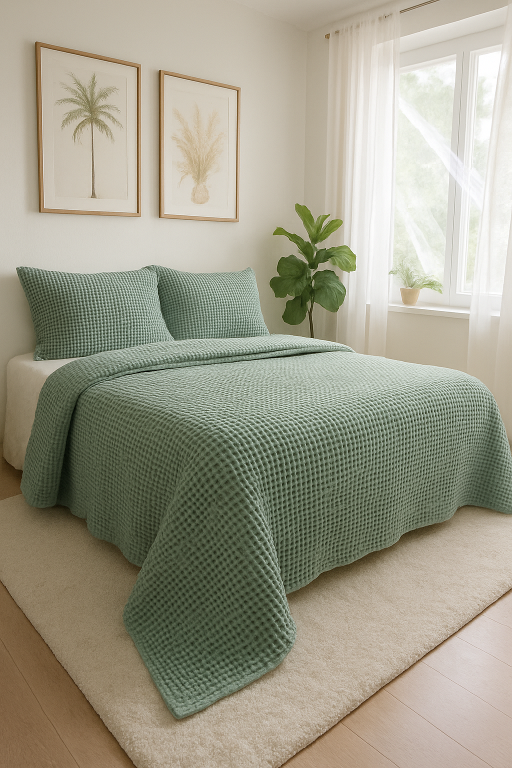 Zeytin yeşilinin huzur verici tonu, waffle dokusunun modern çizgileriyle buluşur. Bu yatak örtüsü, doğadan gelen sadeliği evine taşırken, sıcak bir zarafet ve konfor hissi sunar. 🍃